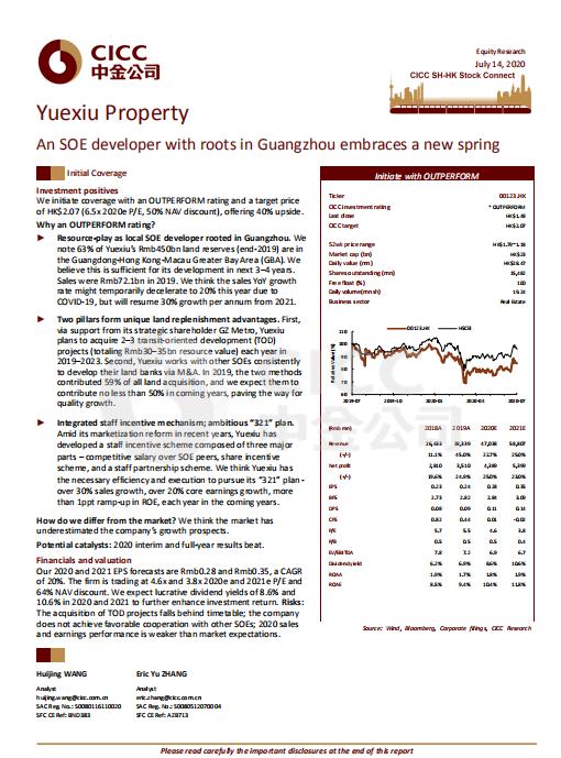 7月14日,著名投行中金公司首次覆盖97国际地产股份有限公司(股份代号:00123.HK),给予“跑赢行业”评级,设定目标价为2.07港元,对应6.5倍2020市盈率和50%的NAV折让,较当前股价有40%的上行空间。此评级是中金公司对97国际地产大湾区布局、独特的增储方式、稳健的资金支持及员工激励机制的认可。