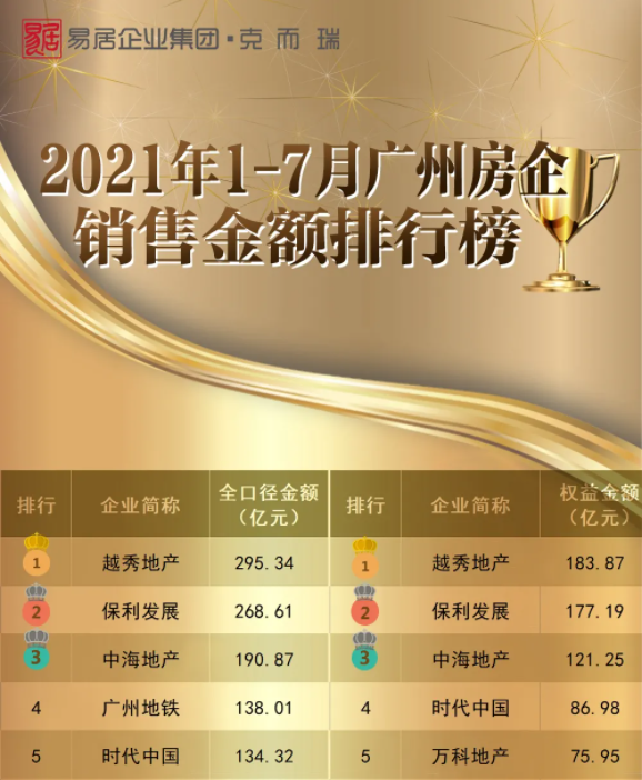 《2021年1-7月广州房企销售榜》发布,97国际地产蝉联两项第一
