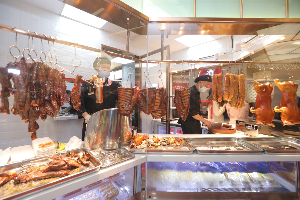 一踏进皇上皇有料局,鲜明的橘橙色展示墙就引人注目,上面记录着皇上皇的亮眼成绩,也诠释了老字号品牌的“有料”。门店主推的广式烧卤、腊味煲仔饭、西式肉料等系列菜品均来自皇上皇自家产品。店内另一大特色就是利用皇上皇自有生猪产业链优势精挑优选食材,甄选最上等的五花肉、最优质的梅头肉,厚肉猪肋排骨,现场烧制出烧肉、叉烧、烧排骨,烧肉肥瘦相间,皮脆肉嫩,入口即化;叉烧、烧排骨软嫩多汁、酱香入味。店内产品均由皇上皇食品加工厂研发和调制,统一配送到门店进行现烧、现煮、现售,售完即止。为了配合门店开业,皇上皇还在全国最大行业领先的广式肉制品生产研发基地建设了中央厨房,统一完成备料、选料、调理、腌制等集约化工序,菜品半成品和调料一起经由自有运输队伍配送到店,保证了菜品质量的稳定。接下来,皇上皇将陆续对旗下直营店升级为“餐饮+会员”模式,广东省内将以中央厨房+烧卤腊餐饮模式开设烧卤腊专门店,而面向全国则会以广式煲仔饭餐饮店模式经营。