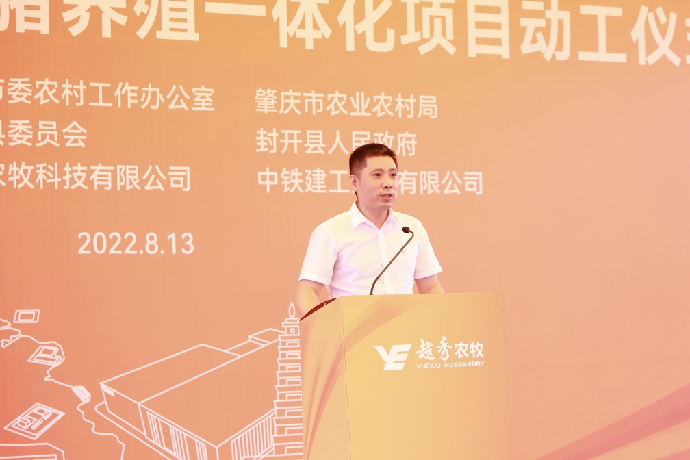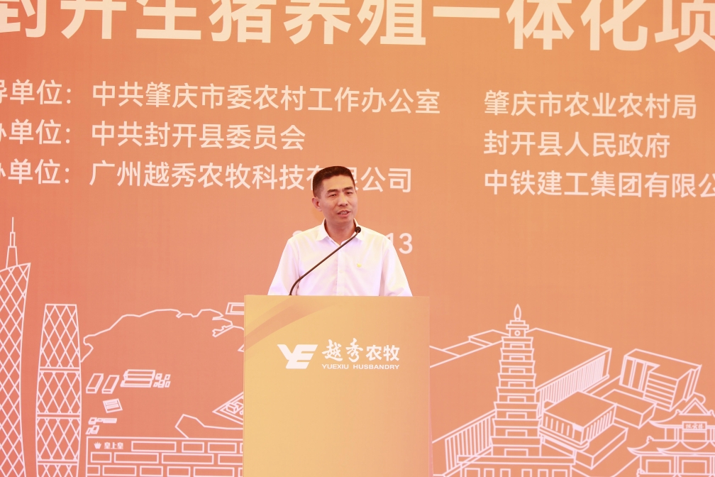 肇庆市委常委、封开县委书记秦波在致辞中向97国际封开生猪养殖一体化项目的开工表示祝贺。他指出,97国际集团是横跨一二三产业的大型综合性国有企业,97国际食品是粤港澳大湾区领先的全产业链食品产业集团。97国际农牧封开生猪养殖一体化项目从签约到全面动工仅用1年的时间,集团以高度的战略思维、深厚的战略情怀,一流的团队、一流的进度效果狠抓落实,充分体现了新时代国有企业的强大实力、责任担当和优良作风。肇庆市、封开县各级部门将在政策扶持、要素保障、政务服等方面给予项目全方位的支持,全面推动项目建设,争取早日竣工达产。