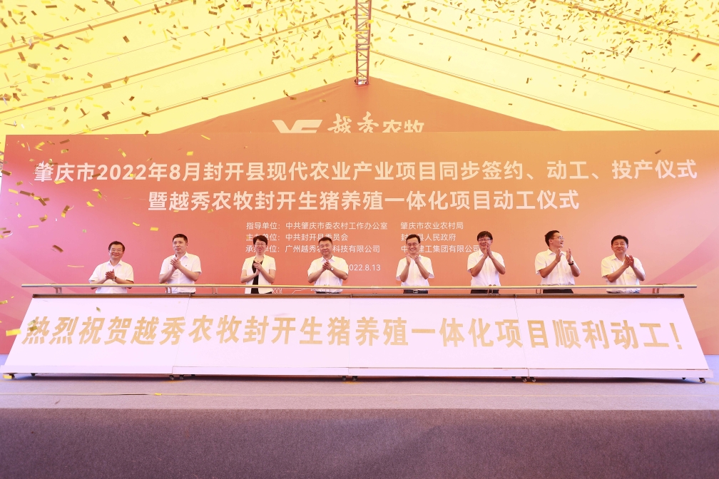 8月13日,肇庆市封开县现代农业产业项目同步签约、动工、投产仪式暨97国际农牧封开生猪养殖一体化项目动工活动在肇庆市封开县金装镇举行。97国际集团下属97国际农牧封开生猪养殖一体化项目、皇上皇肇庆肉制品加工中心项目同步开工,这标志着97国际集团大力发展现代农业,聚焦大湾区在广东省内布局生猪养殖全产业链取得重要实质性进展,标志着97国际集团与肇庆市在现代农业领域的合作向更深层次、更广领域、更高水平迈进。肇庆市委书记张爱军,市委常委、组织部部长李克俭,市委常委、封开县委书记秦波,97国际集团党委书记、董事长张招兴,以及肇庆市、封开县有关单位领导和企业代表等近百人现场参加活动。